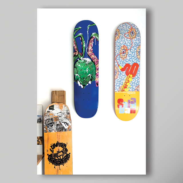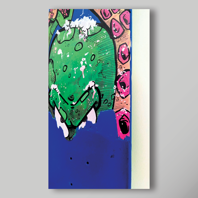 Illustration originale peinte à la main sur planche de skateboard cassée et recyclée.