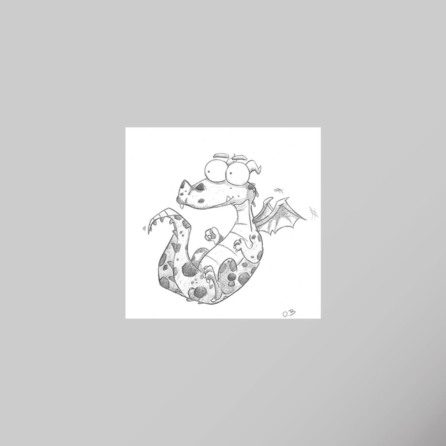 Dessin original d'un de mes personnages emblématiques, Sparky le dragon, déclinés sur plusieurs de mes illustrations.